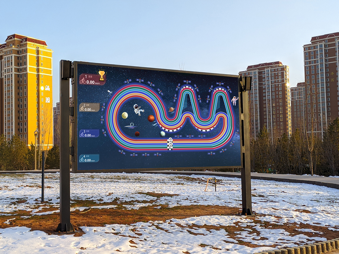 智慧健身车外观造型时尚,主要由单车部分和室外专用显示大屏,可视角度光,色彩艳丽,室外强光下仍能清晰可见,显示画面可根据地方特色和实际游览路线场景定制。